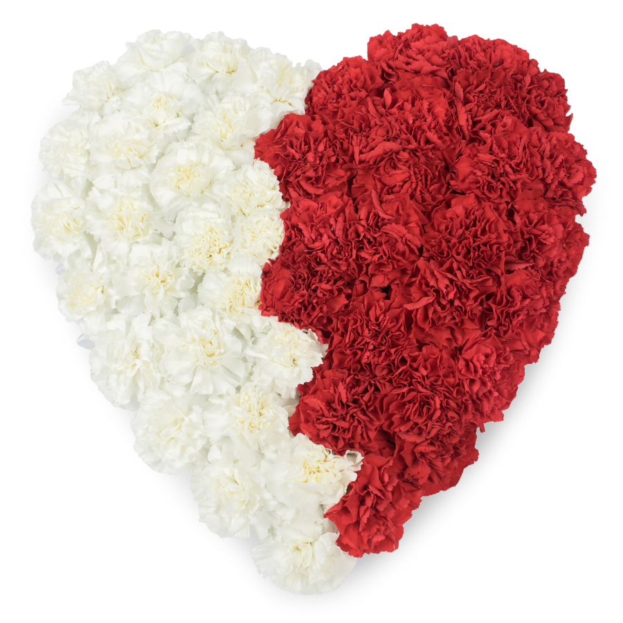 Presenting our exquisite heart-shaped arrangement crafted with a delicate mix of white and red carnations, perfect for expressing heartfelt emotions.